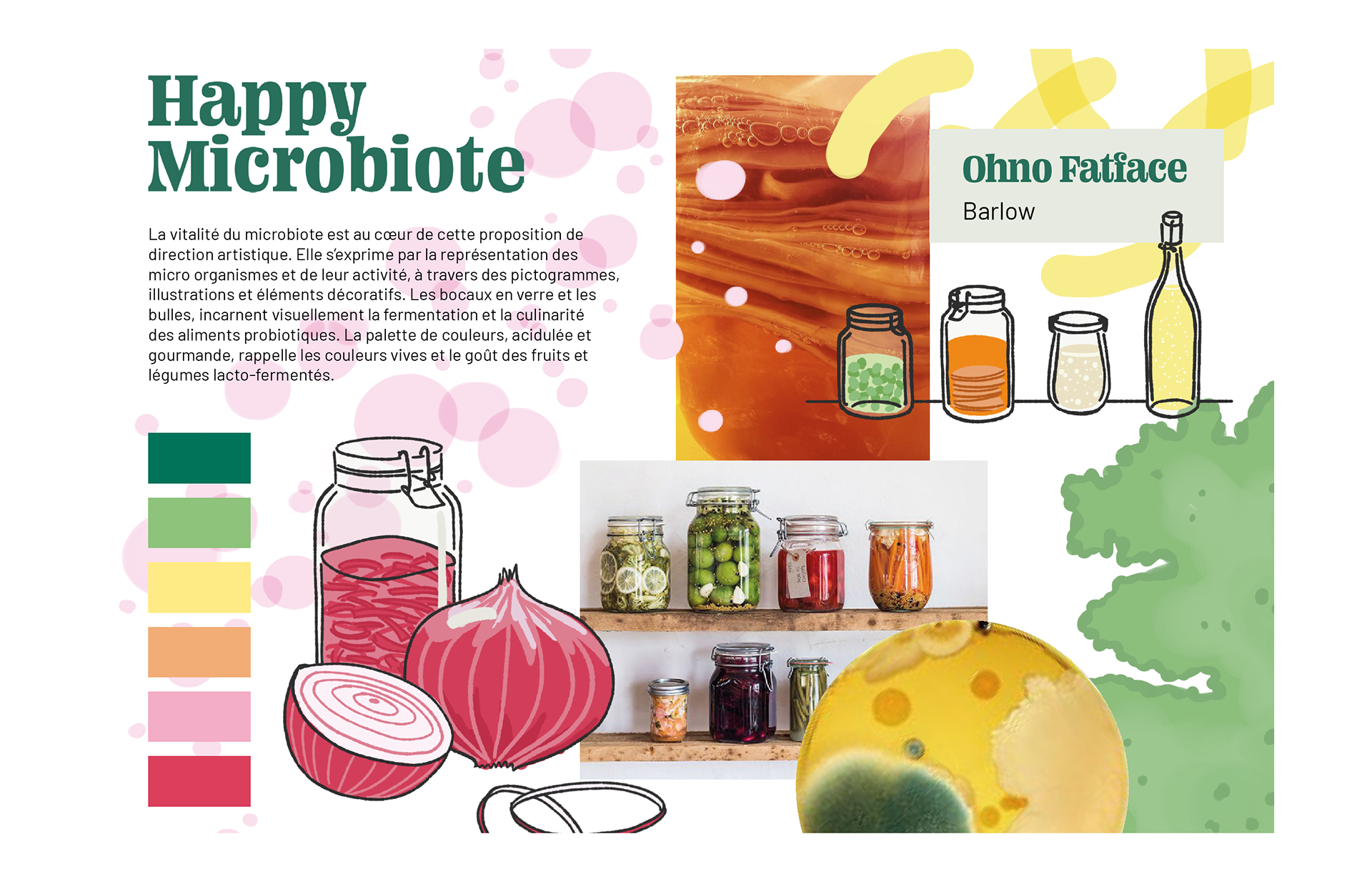 J’ai imaginé une direction artistique centrée sur la vitalité et la transformation, portée par un univers coloré inspiré de la fermentation. Le moodboard mêle motifs organiques, couleurs acidulées et références graphiques ludiques, avec un fil rouge visuel autour des bulles et de l’activité microbienne. Un langage visuel vibrant, pédagogique et joyeux.