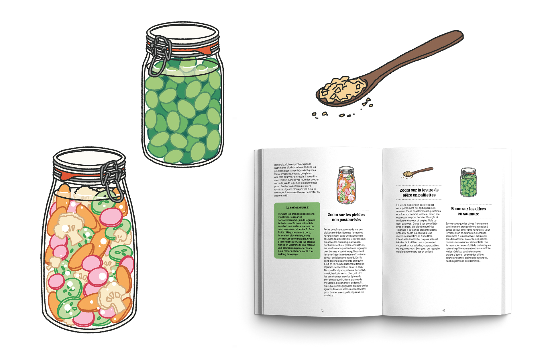Les illustrations se déclinent en deux familles : des schémas pédagogiques expliquant les mécanismes du microbiote, et des illustrations d’ingrédients probiotiques. Ensemble, elles créent un parcours visuel accessible, inspirant et orienté santé et naturopathie, en soutien direct au contenu du livre.